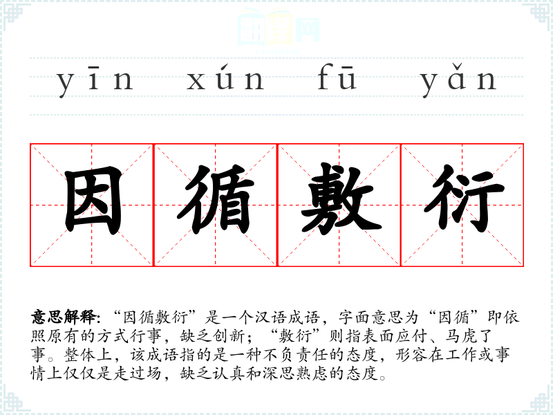 “因循敷衍”是一个汉语成语,字面意思为“因循”即依照原有的方式行事,缺乏创新;“敷衍”则指表面应付、马虎了事。整体上,该成语指的是一种不负责任的态度,形容在工作或事情上仅仅是走过场,缺乏认真和深思熟虑的态度。