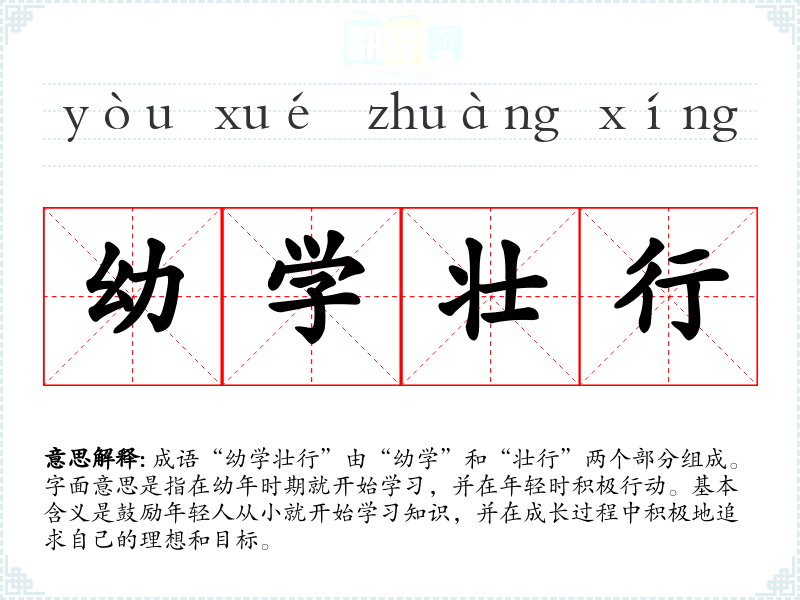 成语“幼学壮行”由“幼学”和“壮行”两个部分组成。字面意思是指在幼年时期就开始学,并在年轻时积极行动。基本含义是鼓励年轻人从小就开始学知识,并在成长过程中积极地追求自己的理想和目标。