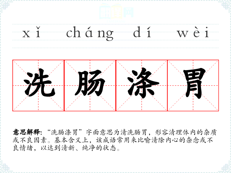 “洗肠涤胃”字面意思为清洗肠胃,形容清理体内的杂质或不良因素。基本含义上,该成语常用来比喻清除内心的杂念或不良情绪,以达到清新、纯净的状态。