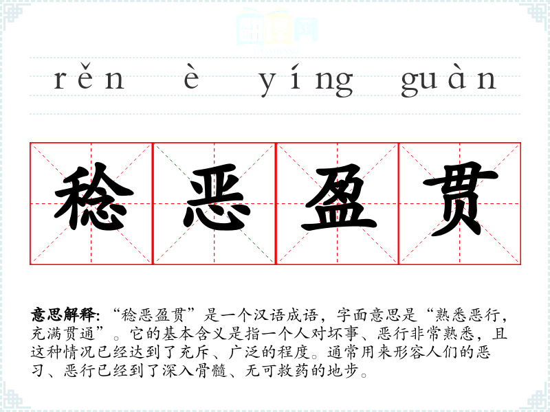 “稔恶盈贯”是一个汉语成语,字面意思是“熟悉恶行,充满贯通”。它的基本含义是指一个人对坏事、恶行非常熟悉,且这种情况已经达到了充斥、广泛的程度。通常用来形容人们的恶*、恶行已经到了深入骨髓、无可救药的地步。