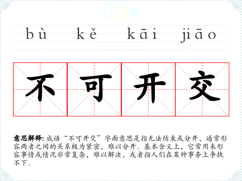 成语“不可开交”字面意思是指无法结束或分开,通常形容两者之间的关系极为紧密,难以分开。基本含义上,它常用来形容事情或情况非常复杂,难以解决,或者指人们在某种事务上争执不下。