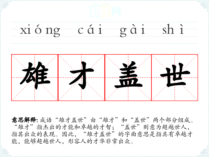成语“雄才盖世”由“雄才”和“盖世”两个部分组成。“雄才”指杰出的才能和卓越的才智;“盖世”则意为超越世人,指其出众的表现。因此,“雄才盖世”的字面意思是指具有卓越才能,能够超越世人,形容人的才华非常出众。