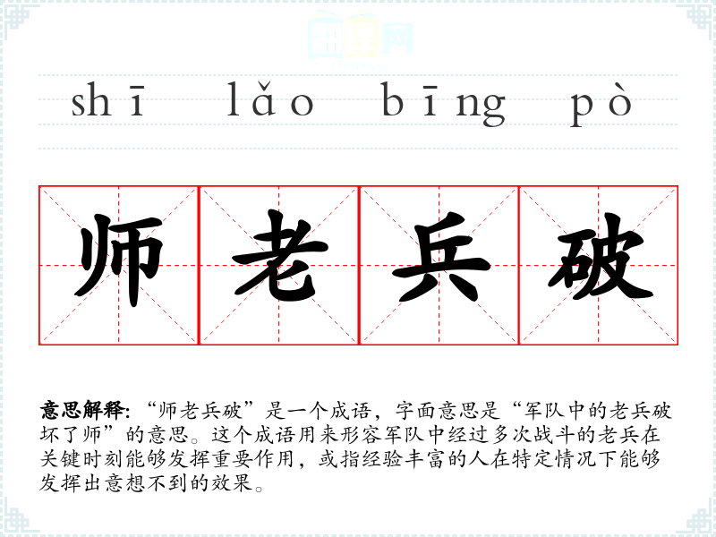 “师老兵破”是一个成语,字面意思是“军队中的老兵破坏了师”的意思。这个成语用来形容军队中经过多次战斗的老兵在关键时刻能够发挥重要作用,或指经验丰富的人在特定情况下能够发挥出意想不到的效果。