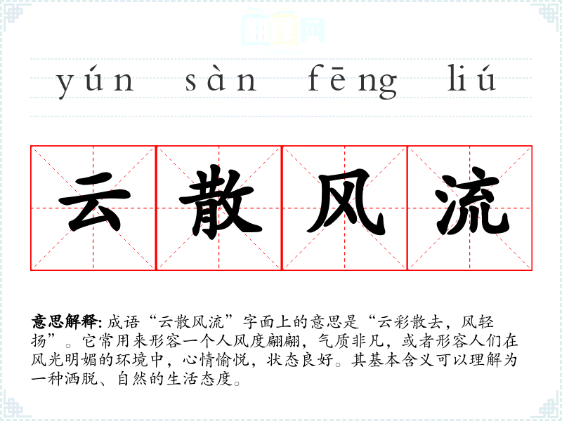 成语“云散风流”字面上的意思是“云彩散去,风轻扬”。它常用来形容一个人风度翩翩,气质非凡,或者形容人们在风光明媚的环境中,心情愉悦,状态良好。其基本含义可以理解为一种洒脱、自然的生活态度。