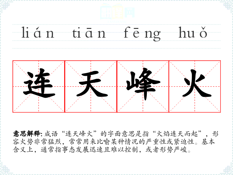 成语“连天峰火”的字面意思是指“火焰连天而起”,形容火势非常猛烈,常常用来比喻某种情况的严重性或紧迫性。基本含义上,通常指事态发展迅速且难以控制,或者形势严峻。
