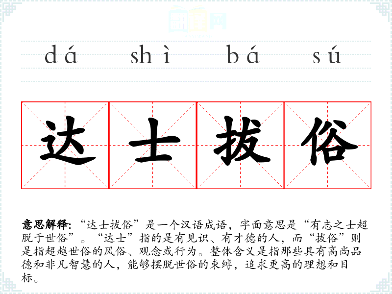 “达士拔俗”是一个汉语成语,字面意思是“有志之士超脱于世俗”。“达士”指的是有见识、有才德的人,而“拔俗”则是指超越世俗的风俗、观念或行为。整体含义是指那些具有高尚品德和非凡智慧的人,能够摆脱世俗的束缚,追求更高的理想和目标。