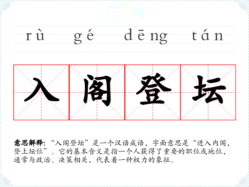 “入阁登坛”是一个汉语成语,字面意思是“进入内阁,登上坛位”。它的基本含义是指一个人获得了重要的职位或地位,通常与政治、决策相关,代表着一种权力的象征。
