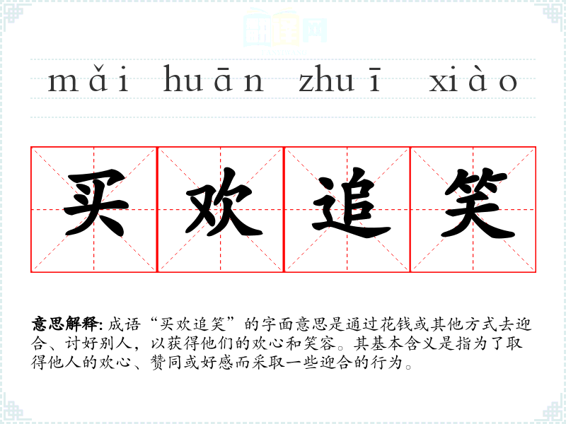 成语“买欢追笑”的字面意思是通过花钱或其他方式去迎合、讨好别人,以获得他们的欢心和笑容。其基本含义是指为了取得他人的欢心、赞同或好感而采取一些迎合的行为。