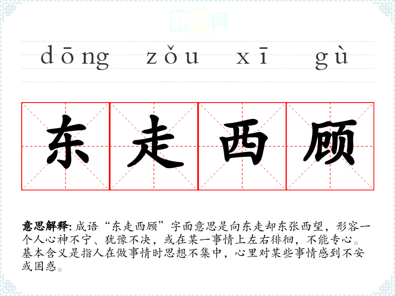 成语“东走西顾”字面意思是向东走却东张西望,形容一个人心神不宁、犹豫不决,或在某一事情上左右徘徊,不能专心。基本含义是指人在做事情时思想不集中,心里对某些事情感到不安或困惑。
