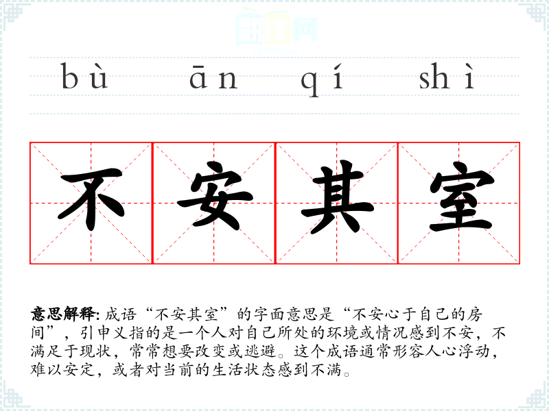 成语“不安其室”的字面意思是“不安心于自己的房间”,引申义指的是一个人对自己所处的环境或情况感到不安,不满足于现状,常常想要改变或逃避。这个成语通常形容人心浮动,难以安定,或者对当前的生活状态感到不满。