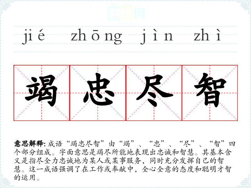 成语“竭忠尽智”由“竭”、“忠”、“尽”、“智”四个部分组成。字面意思是竭尽所能地表现出忠诚和智慧。其基本含义是指尽全力忠诚地为某人或某事服务,同时充分发挥自己的智慧。这一成语强调了在工作或奉献中,全心全意的态度和聪明才智的运用。