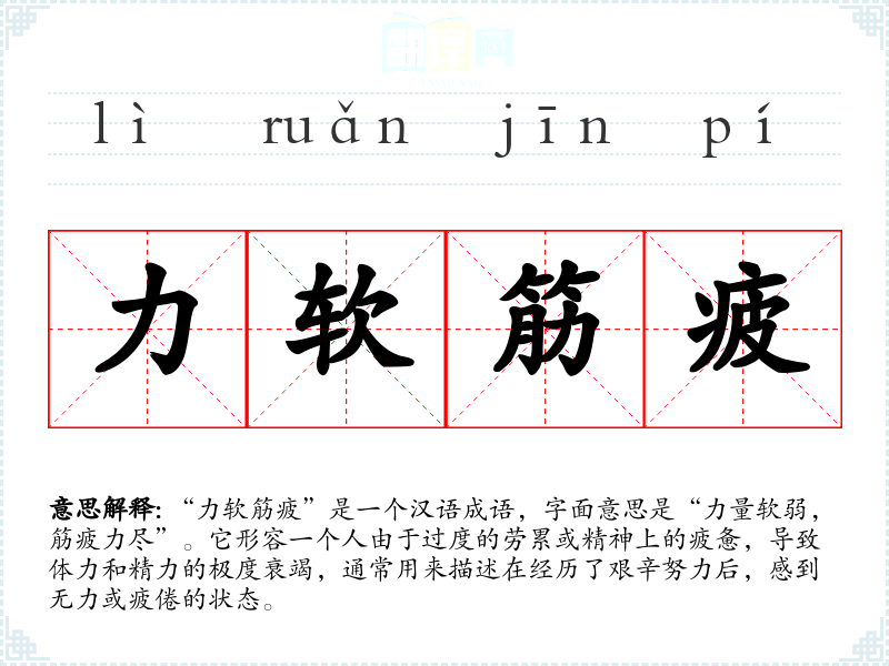 “力软筋疲”是一个汉语成语,字面意思是“力量软弱,筋疲力尽”。它形容一个人由于过度的劳累或精神上的疲惫,导致体力和精力的极度衰竭,通常用来描述在经历了艰辛努力后,感到无力或疲倦的状态。