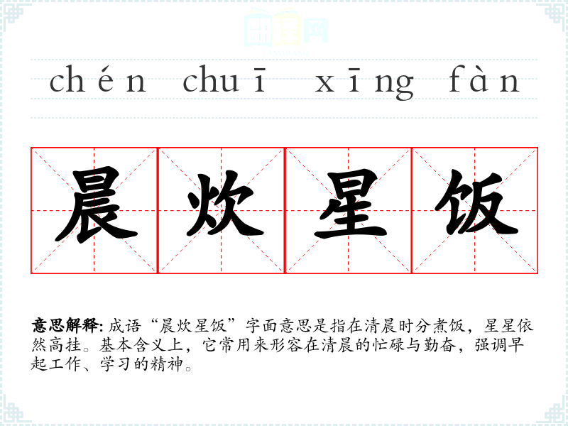 | 晨炊星饭 | 清晨烧早饭,入夜才吃晚饭。形容早出晚归,整日辛勤劳苦。 |