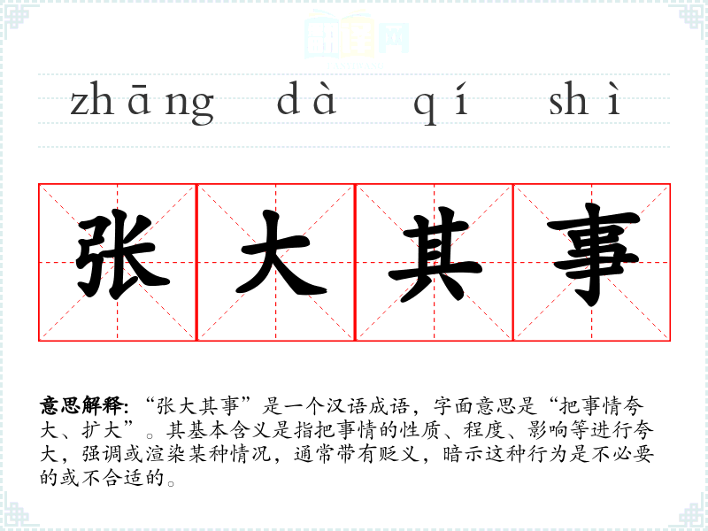 “张大其事”是一个汉语成语,字面意思是“把事情夸大、扩大”。其基本含义是指把事情的性质、程度、影响等进行夸大,强调或渲染某种情况,通常带有贬义,暗示这种行为是不必要的或不合适的。