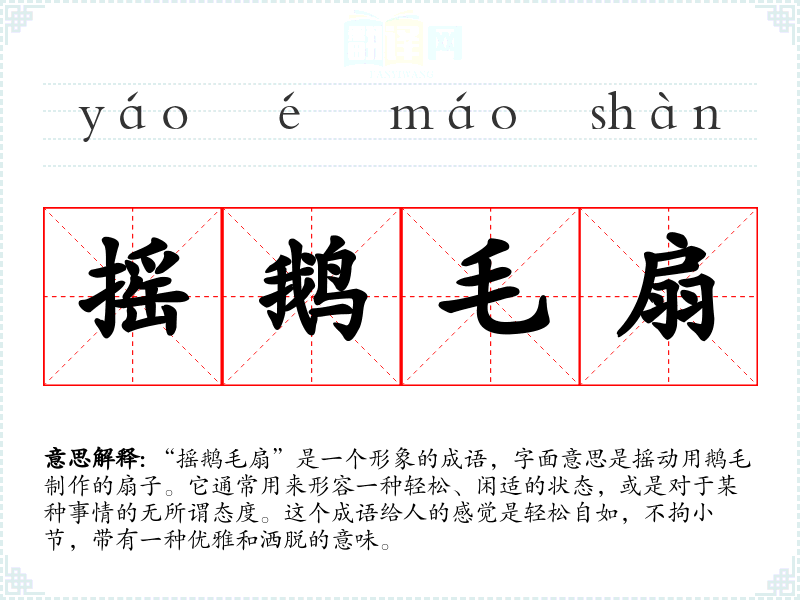 “摇鹅毛扇”是一个形象的成语,字面意思是摇动用鹅毛制作的扇子。它通常用来形容一种轻松、闲适的状态,或是对于某种事情的无所谓态度。这个成语给人的感觉是轻松自如,不拘小节,带有一种优雅和洒脱的意味。