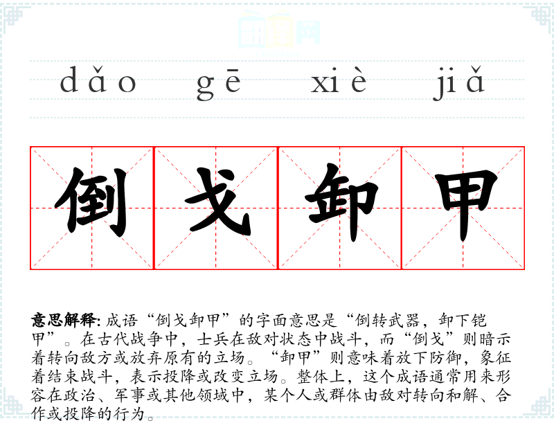 成语“倒戈卸甲”的字面意思是“倒转武器,卸下铠甲”。在古代战争中,士兵在敌对状态中战斗,而“倒戈”则暗示着转向敌方或放弃原有的立场。“卸甲”则意味着放下防御,象征着结束战斗,表示投降或改变立场。整体上,这个成语通常用来形容在政治、军事或其他领域中,某个人或群体由敌对转向和解、合作或投降的行为。