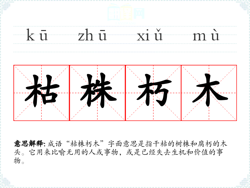 成语“枯株朽木”字面意思是指干枯的树株和腐朽的木头。它用来比喻无用的人或事物,或是已经失去生机和价值的事物。
