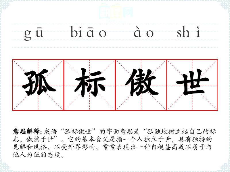 成语“孤标傲世”的字面意思是“孤独地树立起自己的标志,傲然于世”。它的基本含义是指一个人独立于世,具有独特的见解和风格,不受外界影响,常常表现出一种自视甚高或不屑于与他人为伍的态度。