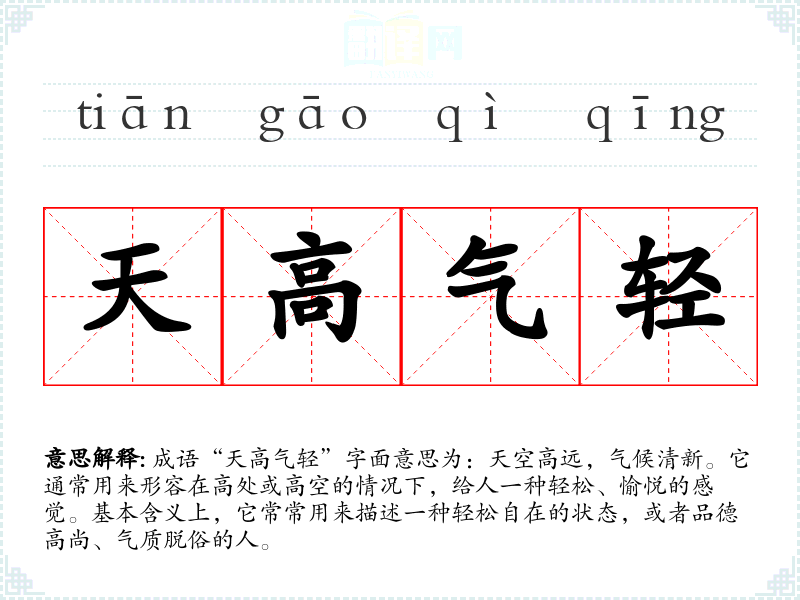 成语“天高气轻”字面意思为:天空高远,气候清新。它通常用来形容在高处或高空的情况下,给人一种轻松、愉悦的感觉。基本含义上,它常常用来描述一种轻松自在的状态,或者品德高尚、气质脱俗的人。