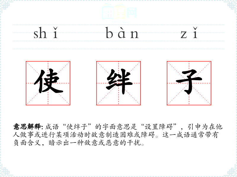 成语“使绊子”的字面意思是“设置障碍”,引申为在他人做事或进行某项活动时故意制造困难或障碍。这一成语通常带有负面含义,暗示出一种敌意或恶意的干扰。