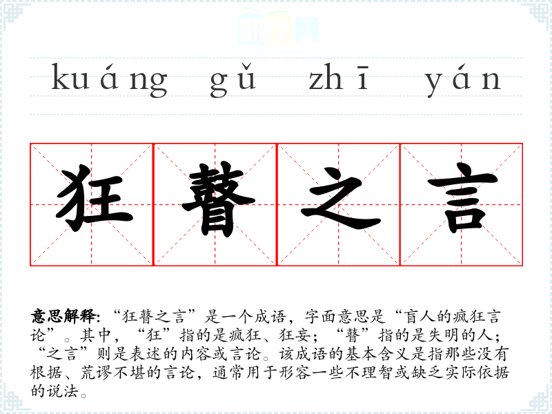 “狂瞽之言”是一个成语,字面意思是“盲人的疯狂言论”。其中,“狂”指的是疯狂、狂妄;“瞽”指的是失明的人;“之言”则是表述的内容或言论。该成语的基本含义是指那些没有根据、荒谬不堪的言论,通常用于形容一些不理智或缺乏实际依据的说法。