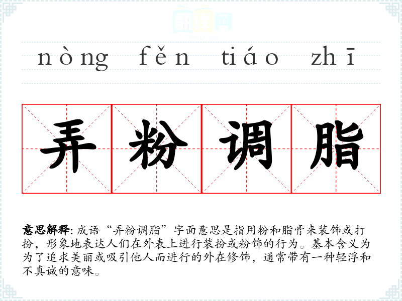 “弄粉调脂”源于古代对女性妆容的描绘,尤其是在一些文学作品中,常常用来形容女子为了吸引他人而精心打扮。具体的历史典故不详,但可以推测在古代,妆扮被视为女性的一种重要社交技能。
