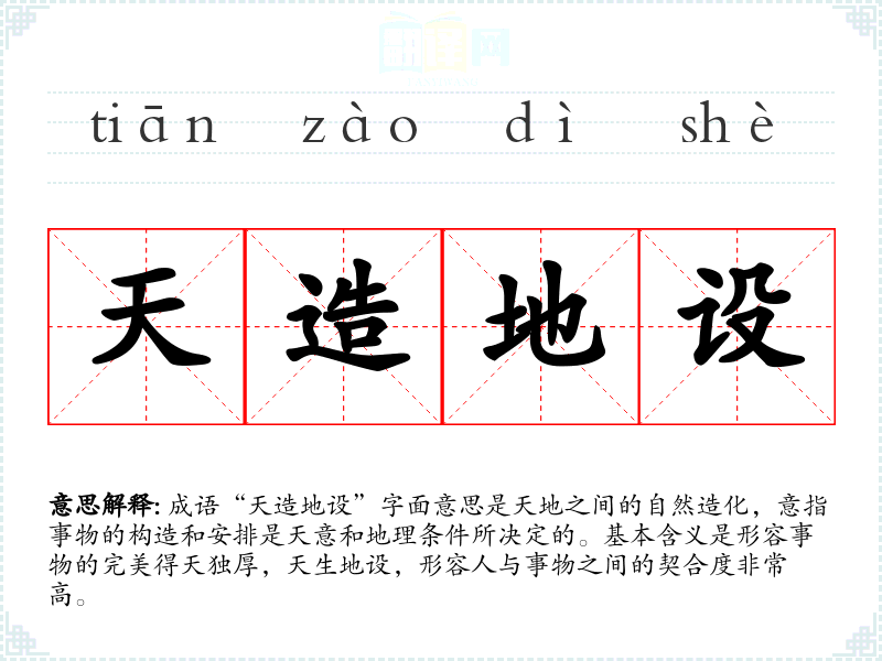 成语“天造地设”字面意思是天地之间的自然造化,意指事物的构造和安排是天意和地理条件所决定的。基本含义是形容事物的完美得天独厚,天生地设,形容人与事物之间的契合度非常高。