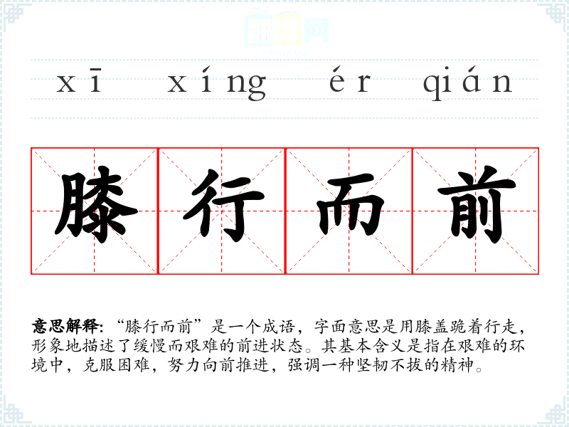 “膝行而前”是一个成语,字面意思是用膝盖跪着行走,形象地描述了缓慢而艰难的前进状态。其基本含义是指在艰难的环境中,克服困难,努力向前推进,强调一种坚韧不拔的精神。