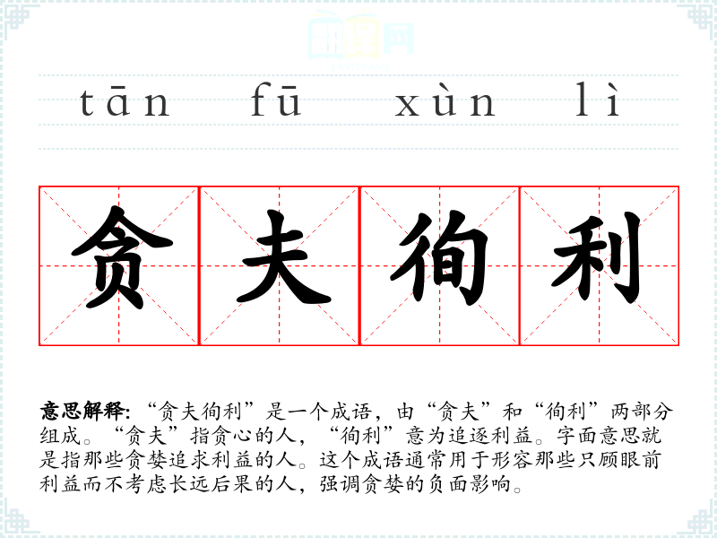“贪夫徇利”是一个成语,由“贪夫”和“徇利”两部分组成。“贪夫”指贪心的人,“徇利”意为追逐利益。字面意思就是指那些贪婪追求利益的人。这个成语通常用于形容那些只顾眼前利益而不考虑长远后果的人,强调贪婪的负面影响。