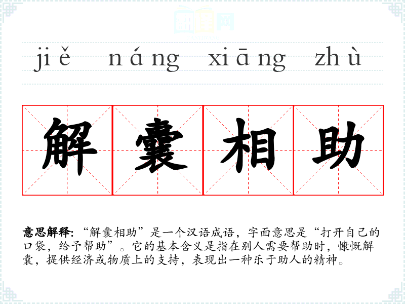 | 解囊相助 | 囊:口袋。拿出财物帮助别人。 |