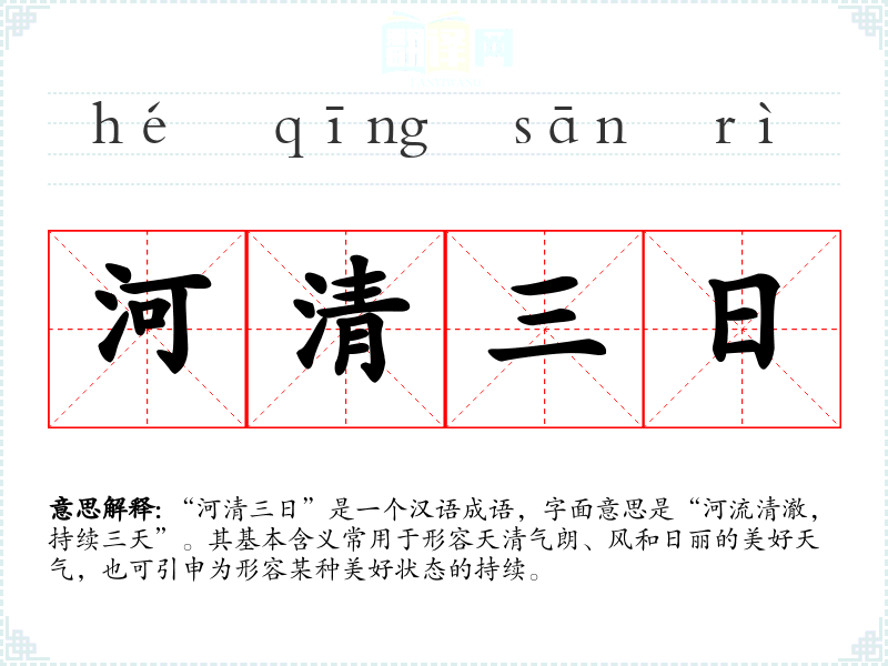 “河清三日”是一个汉语成语,字面意思是“河流清澈,持续三天”。其基本含义常用于形容天清气朗、风和日丽的美好天气,也可引申为形容某种美好状态的持续。
