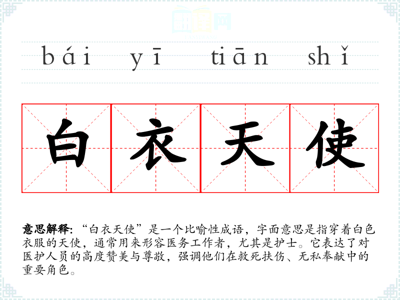 “白衣天使”是一个比喻性成语,字面意思是指穿着白色衣服的天使,通常用来形容医务工作者,尤其是护士。它表达了对医护人员的高度赞美与尊敬,强调他们在救死扶伤、无私奉献中的重要角色。