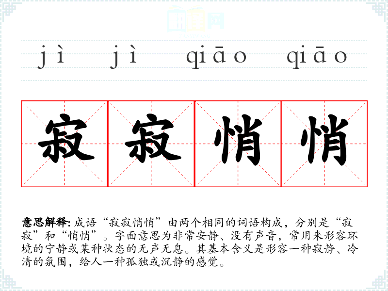 成语“寂寂悄悄”由两个相同的词语构成,分别是“寂寂”和“悄悄”。字面意思为非常安静、没有声音,常用来形容环境的宁静或某种状态的无声无息。其基本含义是形容一种寂静、冷清的氛围,给人一种孤独或沉静的感觉。