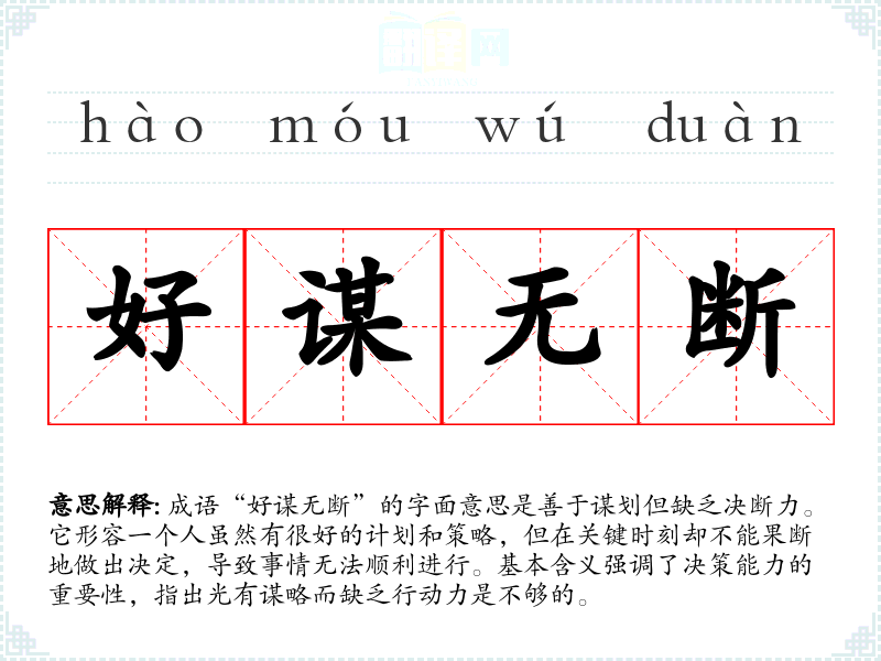 成语“好谋无断”的字面意思是善于谋划但缺乏决断力。它形容一个人虽然有很好的计划和策略,但在关键时刻却不能果断地做出决定,导致事情无法顺利进行。基本含义强调了决策能力的重要性,指出光有谋略而缺乏行动力是不够的。