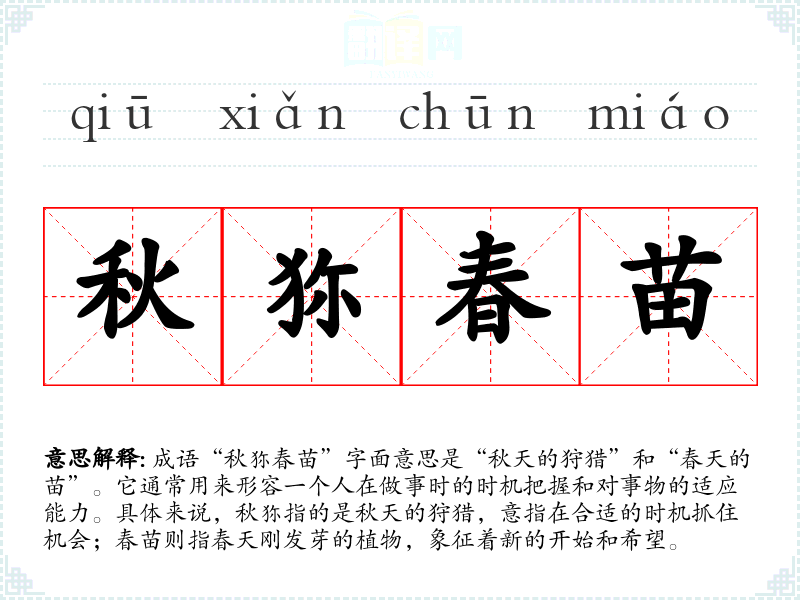 通过对“秋狝春苗”的深入学习,我认识到在生活中,无论是学习、工作还是人际交往,把握时机都是极其重要的。这不仅丰富了我的语言表达,也让我在实际生活中更加注重抓住每一个机会。