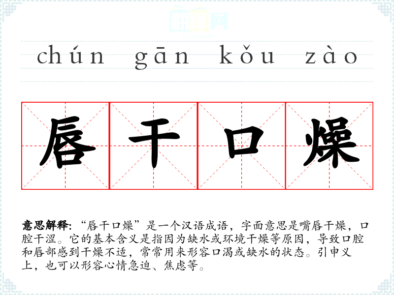 “唇干口燥”是一个汉语成语,字面意思是嘴唇干燥,口腔干涩。它的基本含义是指因为缺水或环境干燥等原因,导致口腔和唇部感到干燥不适,常常用来形容口渴或缺水的状态。引申义上,也可以形容心情急迫、焦虑等。