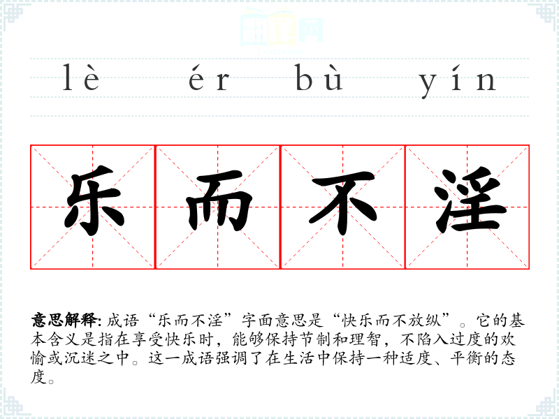 成语“乐而不淫”字面意思是“快乐而不放纵”。它的基本含义是指在享受快乐时,能够保持节制和理智,不陷入过度的欢愉或沉迷之中。这一成语强调了在生活中保持一种适度、平衡的态度。