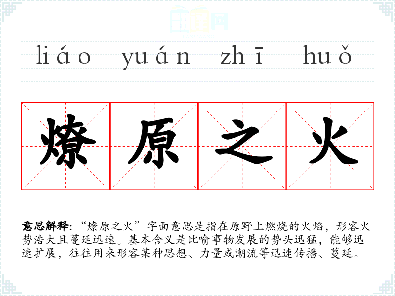 “燎原之火”字面意思是指在原野上燃烧的火焰,形容火势浩大且蔓延迅速。基本含义是比喻事物发展的势头迅猛,能够迅速扩展,往往用来形容某种思想、力量或潮流等迅速传播、蔓延。