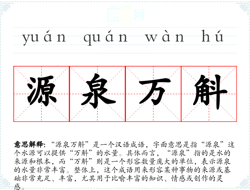 “源泉万斛”是一个汉语成语,字面意思是指“源泉”这个水源可以提供“万斛”的水量。具体而言,“源泉”指的是水的来源和根本,而“万斛”则是一个形容数量庞大的单位,表示源泉的水量非常丰富。整体上,这个成语用来形容某种事物的来源或基础非常充足、丰富,尤其用于比喻丰富的知识、情感或创作的灵感。