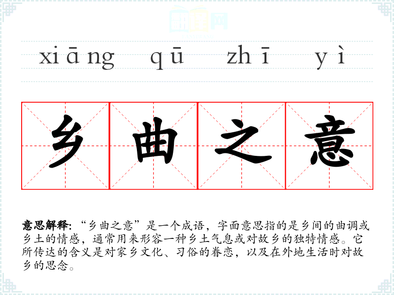 “乡曲之意”是一个成语,字面意思指的是乡间的曲调或乡土的情感,通常用来形容一种乡土气息或对故乡的独特情感。它所传达的含义是对家乡文化、*俗的眷恋,以及在外地生活时对故乡的思念。