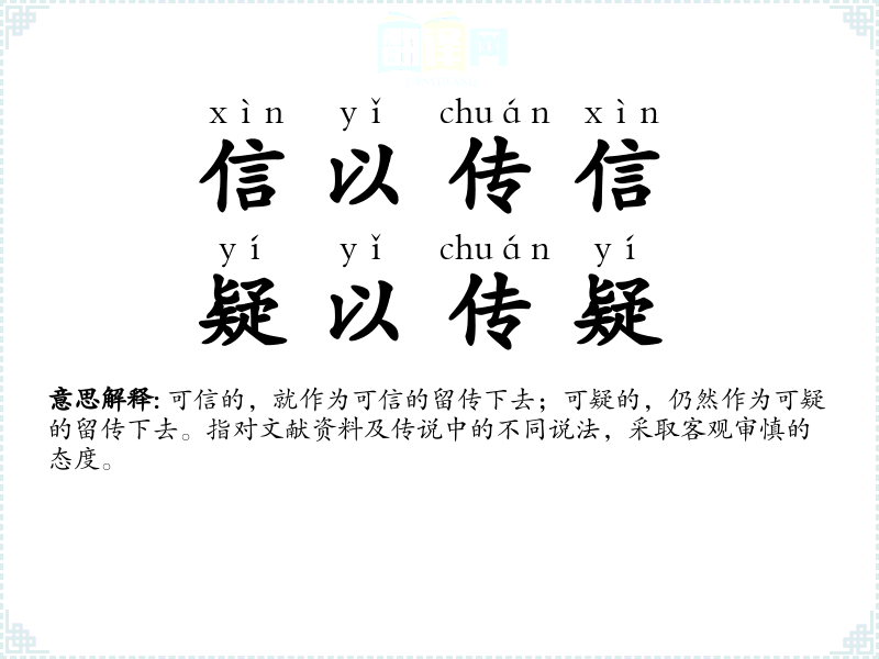 可信的,就作为可信的留传下去;可疑的,仍然作为可疑的留传下去。指对文献资料及传说中的不同说法,采取客观审慎的态度。 |