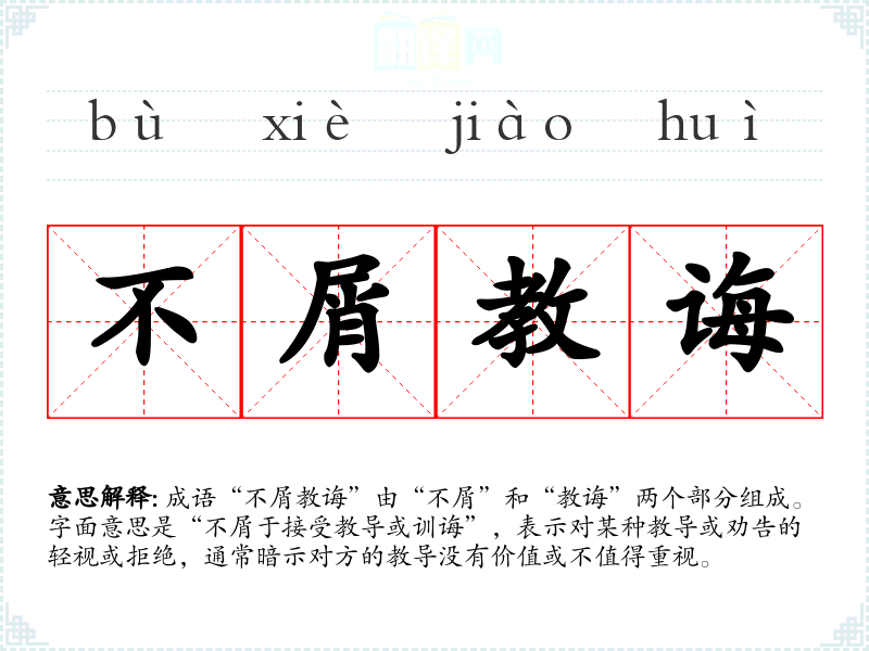 成语“不屑教诲”由“不屑”和“教诲”两个部分组成。字面意思是“不屑于接受教导或训诲”,表示对某种教导或劝告的轻视或拒绝,通常暗示对方的教导没有价值或不值得重视。