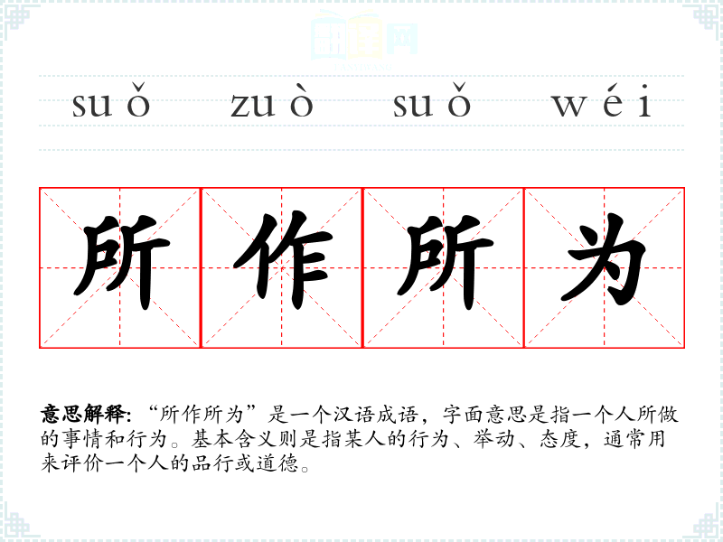 “所作所为”是一个汉语成语,字面意思是指一个人所做的事情和行为。基本含义则是指某人的行为、举动、态度,通常用来评价一个人的品行或道德。