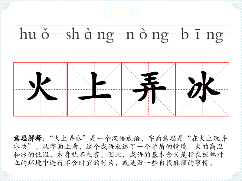 “火上弄冰”是一个汉语成语,字面意思是“在火上玩弄冰块”。从字面上看,这个成语表达了一个矛盾的情境:火的高温和冰的低温,本身就不相容。因此,成语的基本含义是指在极端对立的环境中进行不合时宜的行为,或是做一些自找麻烦的事情。
