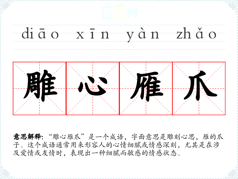“雕心雁爪”是一个成语,字面意思是雕刻心思,雁的爪子。这个成语通常用来形容人的心情细腻或情感深刻,尤其是在涉及爱情或友情时,表现出一种细腻而敏感的情感状态。