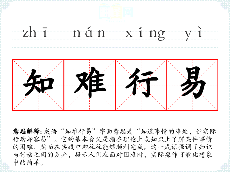 成语“知难行易”字面意思是“知道事情的难处,但实际行动却容易”。它的基本含义是指在理论上或知识上了解某件事情的困难,然而在实践中却往往能够顺利完成。这一成语强调了知识与行动之间的差异,提示人们在面对困难时,实际操作可能比想象中的简单。