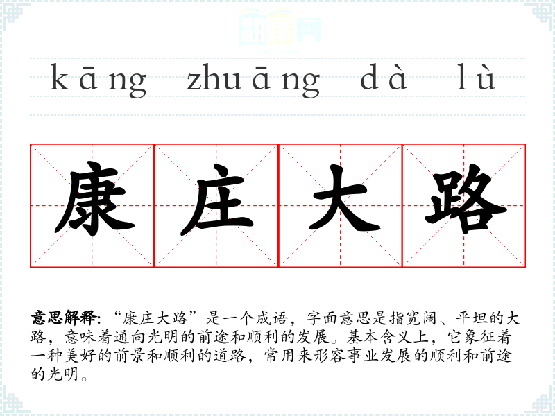 “康庄大路”是一个成语,字面意思是指宽阔、平坦的大路,意味着通向光明的前途和顺利的发展。基本含义上,它象征着一种美好的前景和顺利的道路,常用来形容事业发展的顺利和前途的光明。
