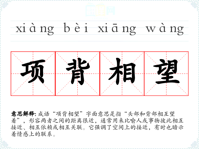 成语“项背相望”字面意思是指“头部和背部相互望着”,形容两者之间的距离很近,通常用来比喻人或事物彼此相互接近、相互依赖或相互关联。它强调了空间上的接近,有时也暗示着情感上的联系。