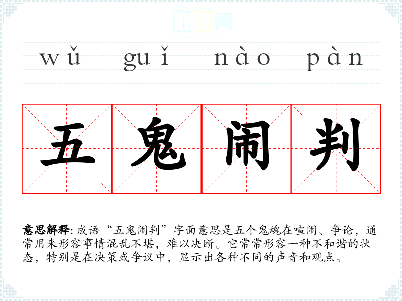 成语“五鬼闹判”字面意思是五个鬼魂在喧闹、争论,通常用来形容事情混乱不堪,难以决断。它常常形容一种不和谐的状态,特别是在决策或争议中,显示出各种不同的声音和观点。