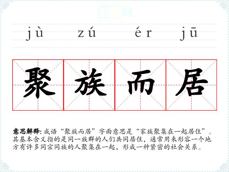 成语“聚族而居”字面意思是“家族聚集在一起居住”。其基本含义指的是同一族群的人们共同居住,通常用来形容一个地方有许多同宗同族的人聚集在一起,形成一种紧密的社会关系。